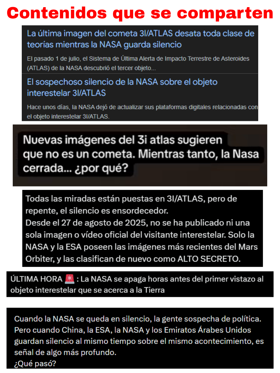 - Usuarios en redes sociales comparten contenidos sin contrastar y desinformación, algunos diciendo que la NASA, afectada por el cierre del Gobierno de Estados Unidos, está ocultando información sobre el cometa.