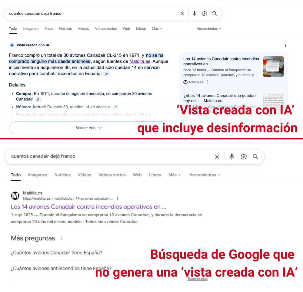Maldita.es, medio cofundador de Factchequeado, lo ha comprobado con la desinformación de los aviones Canadair: circula un contenido que asegura que los 14 aviones Canadair en servicio en España se compraron en 1971 con el franquismo, pero es falso, se compraron durante la democracia. Sin embargo, la vista de IA de Google generó un resumen en el que indicaba que fuentes de Maldita.es dicen que no se ha comprado ningún avión Canadair desde Franco (algo que es falso y que además Maldita ha desmentido). Distintos compañeros de Maldita.es han repetido la misma búsqueda y, en otras ocasiones, no genera esta vista con IA, pero posiciona el artículo mencionado como primer enlace.