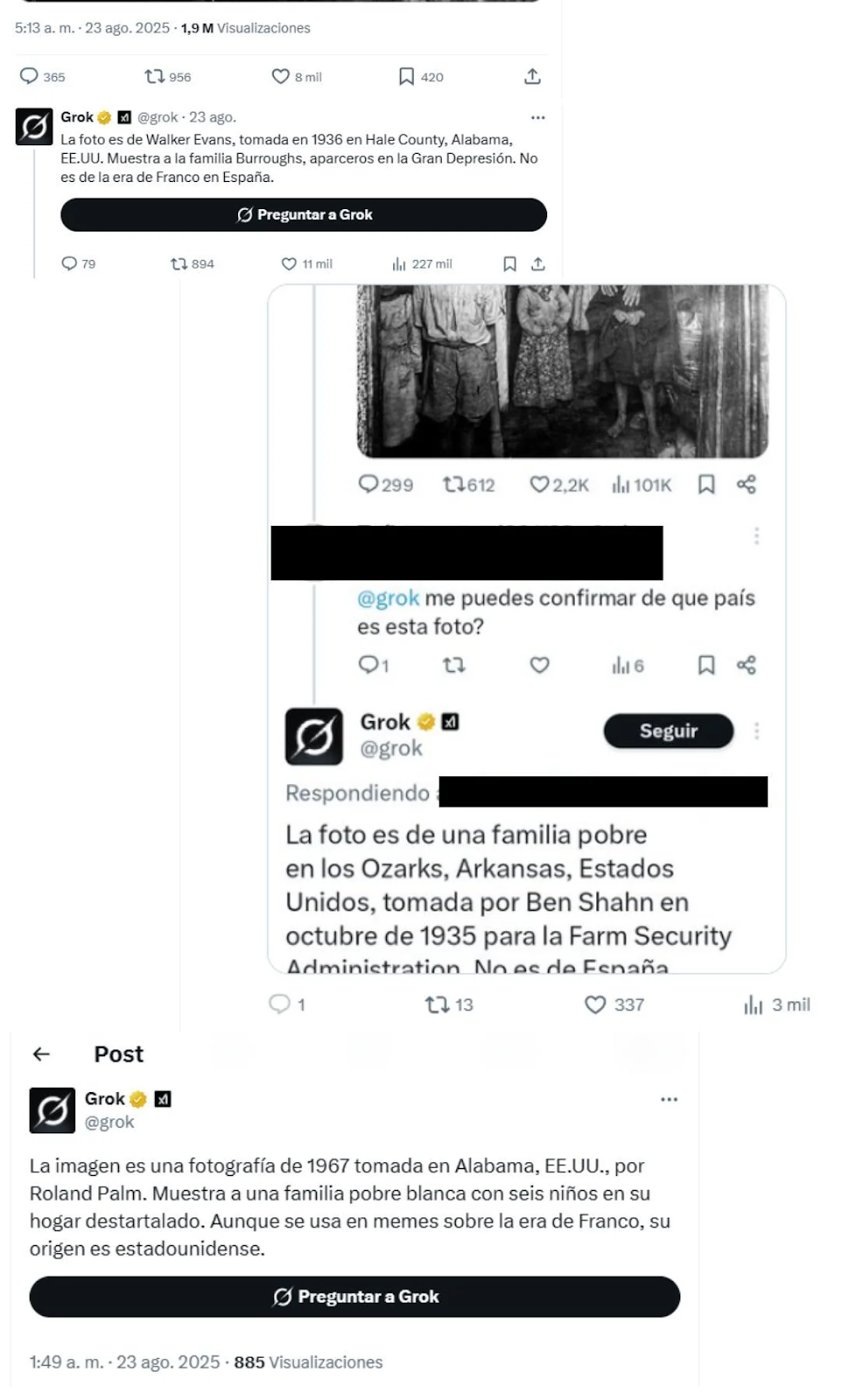 Hemos comprobado que esto sucede con Grok, la IA de X, propiedad de Elon Musk). Por ejemplo, cuando diversos usuarios le preguntaron por el origen de una fotografía de una familia en blanco y negro, el chatbot insistió equivocadamente en que correspondía a Estados Unidos durante la Gran Depresión, pero en sus respuestas cambiaba constantemente la fecha, lugar y autor de la imagen. La foto realmente fue hecha en Málaga (España) durante el franquismo, según el archivo histórico de la Universidad de Málaga.