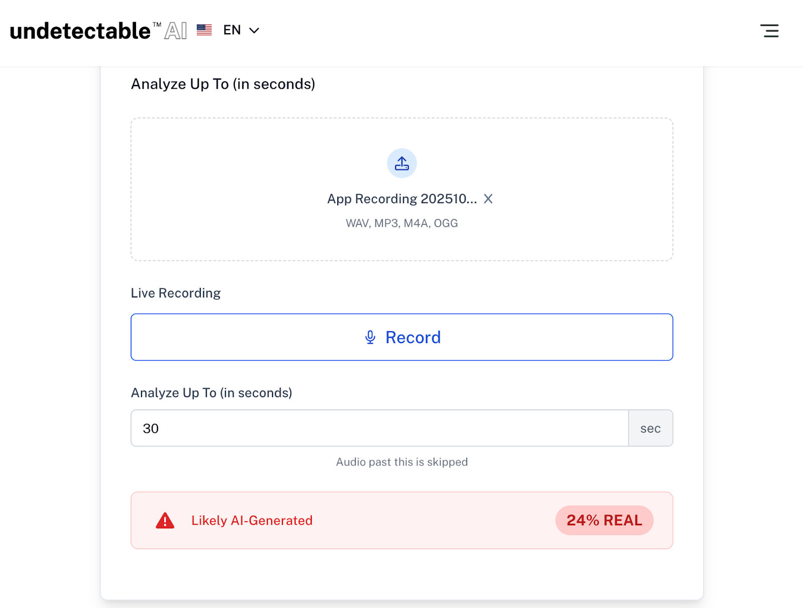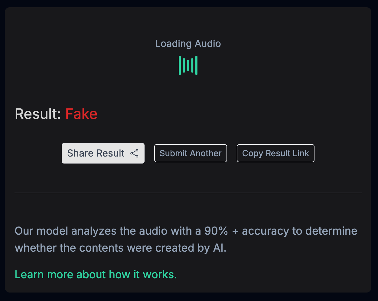 Desde Factchequeado hicimos un análisis del audio de los videos con Resemble AI y Undetectable AI, herramientas de detección de contenido IA. El análisis de Resemble AI lo clasifica como “Fake” (falso, en español) y el de Undetectable AI indica que tiene sólo un 24% de probabilidades de ser real.