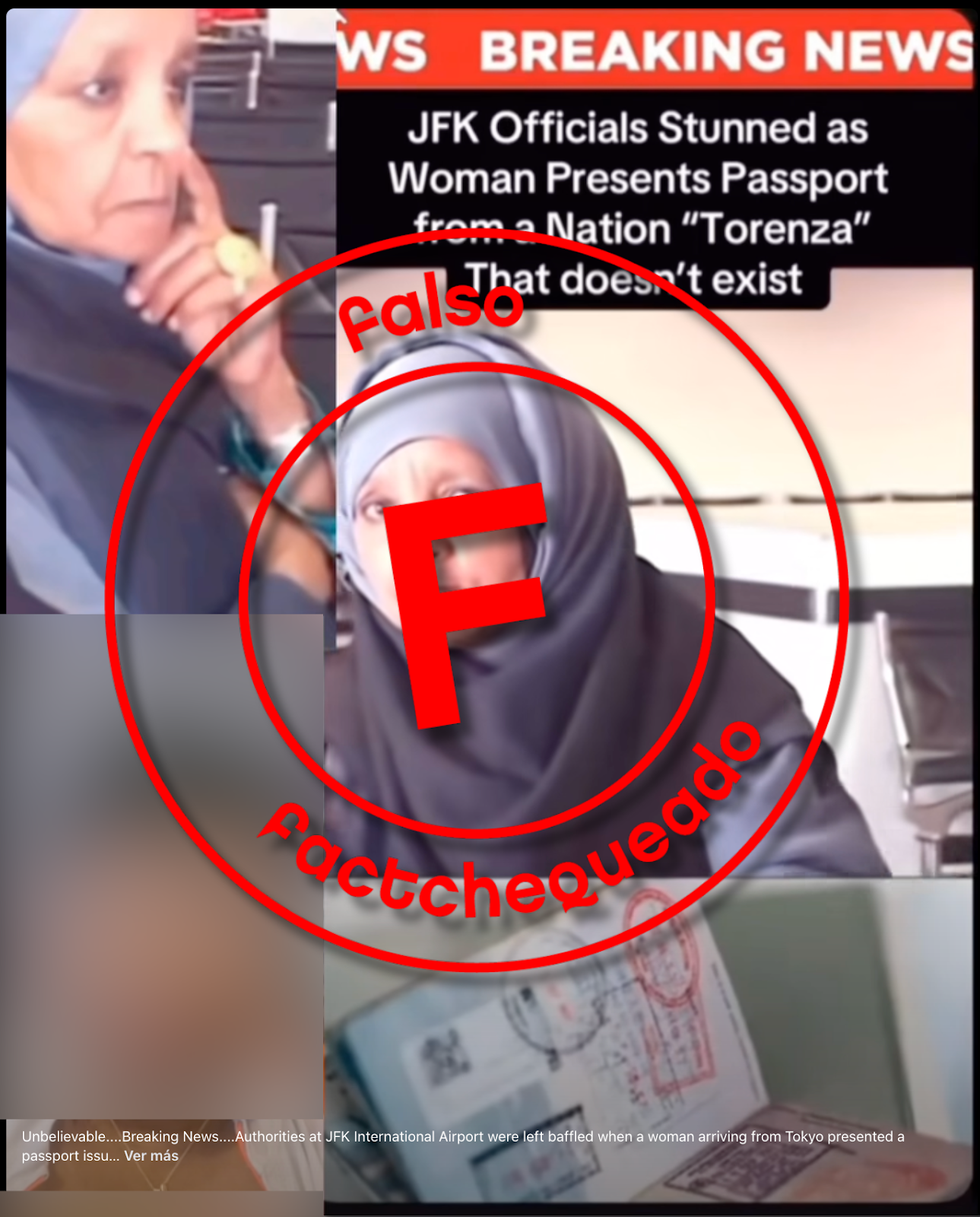 - Se viralizaron videos sobre una mujer que aparentemente llegó al Aeropuerto internacional John F. Kennedy de Nueva York con un pasaporte de “Torenza”, un país que no existe. Esto es falso.
