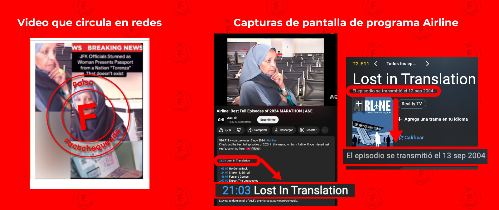 Investigamos en los episodios de la serie Airlines publicados en la cuenta de YouTube de A&E y encontramos uno con las mismas las imágenes de los videos virales, en el que se explicaba que se trataba de una mujer que no hablaba inglés siendo asistida por una empleada del aeropuerto. La descripción del video dice que se trata del capítulo “Lost in Translation” (Perdido en la Traducción) de la serie “Airline!”.