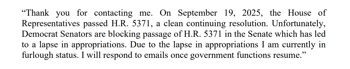 “Gracias por ponerse en contacto conmigo. El 19 de septiembre de 2025, la Cámara de Representantes aprobó la H.R. 5371, una resolución limpia y continua. Desafortunadamente, los senadores demócratas están bloqueando la aprobación de la H.R. 5371 en el Senado, lo que ha provocado una interrupción en las asignaciones presupuestarias. Debido a esta interrupción, actualmente me encuentro en situación de licencia. Responderé a los correos electrónicos una vez que se reanuden las funciones del gobierno”.