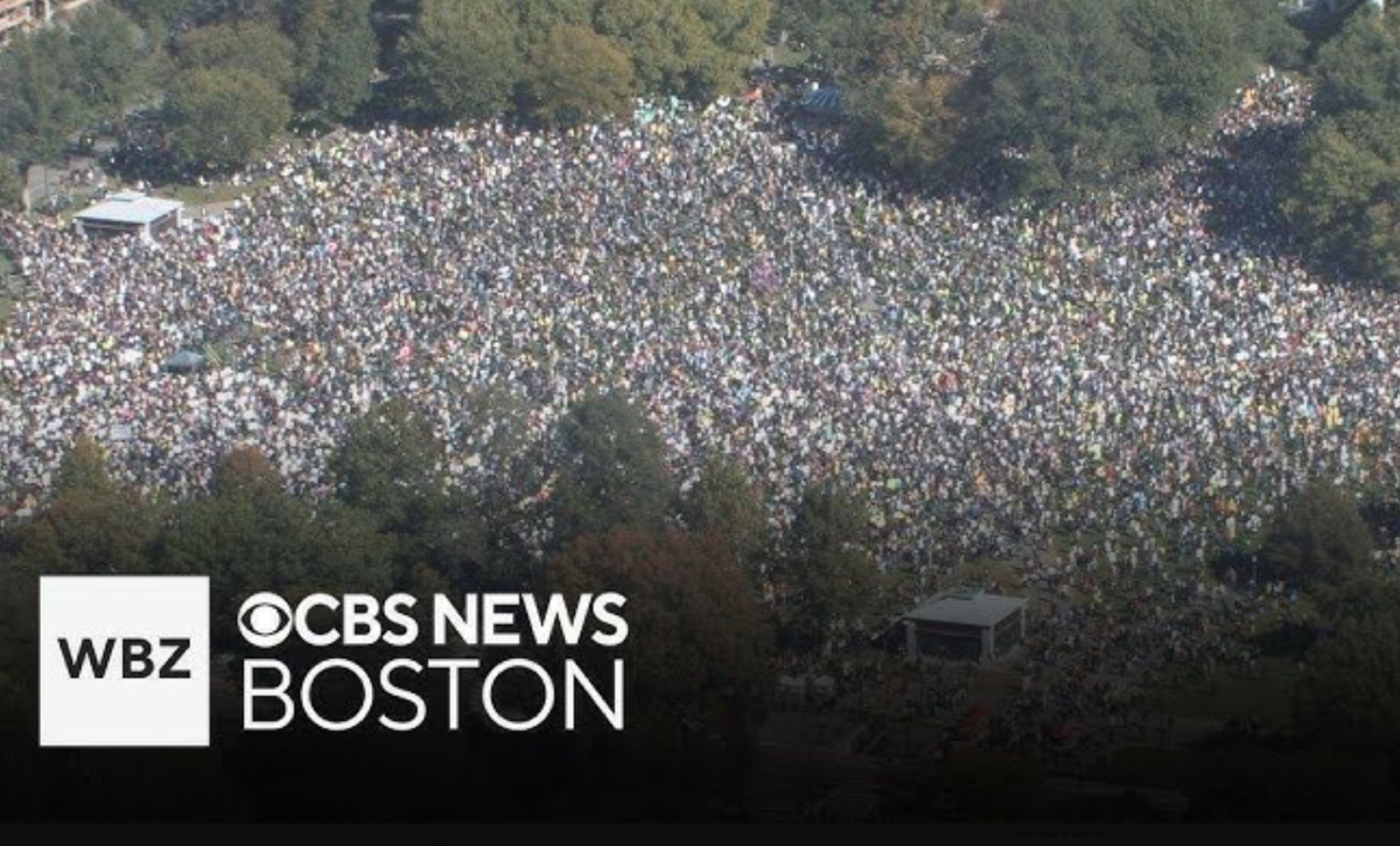 5. Captura de pantalla de un video de CBS News donde aparece una imagen de la protesta del 18 de octubre en Boston, en el que señala que de acuerdo con los organizadores habrían participado unas 100,000. El video puedes verlo aquí.