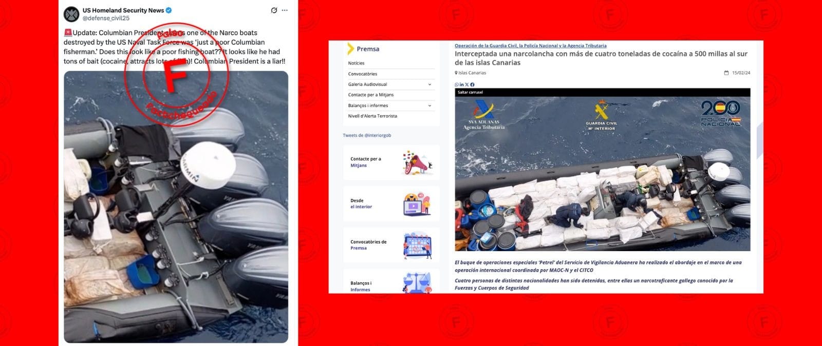 Varios usuarios en X notaron correctamente que lo que afirmaba esa cuenta era falso. Una búsqueda inversa en Google hecha por Factchequeado mostró que la foto de la lancha publicada por esta cuenta no era reciente, sino que correspondía con una lancha interceptada el 15 de febrero de 2024 al sur de las islas Canarias que, de acuerdo con las autoridades españolas, llevaba más de 4 toneladas de cocaína. La cuenta eliminó la publicación, pero la imagen desinformante tuvo más de 2.6 millones de reproducciones.