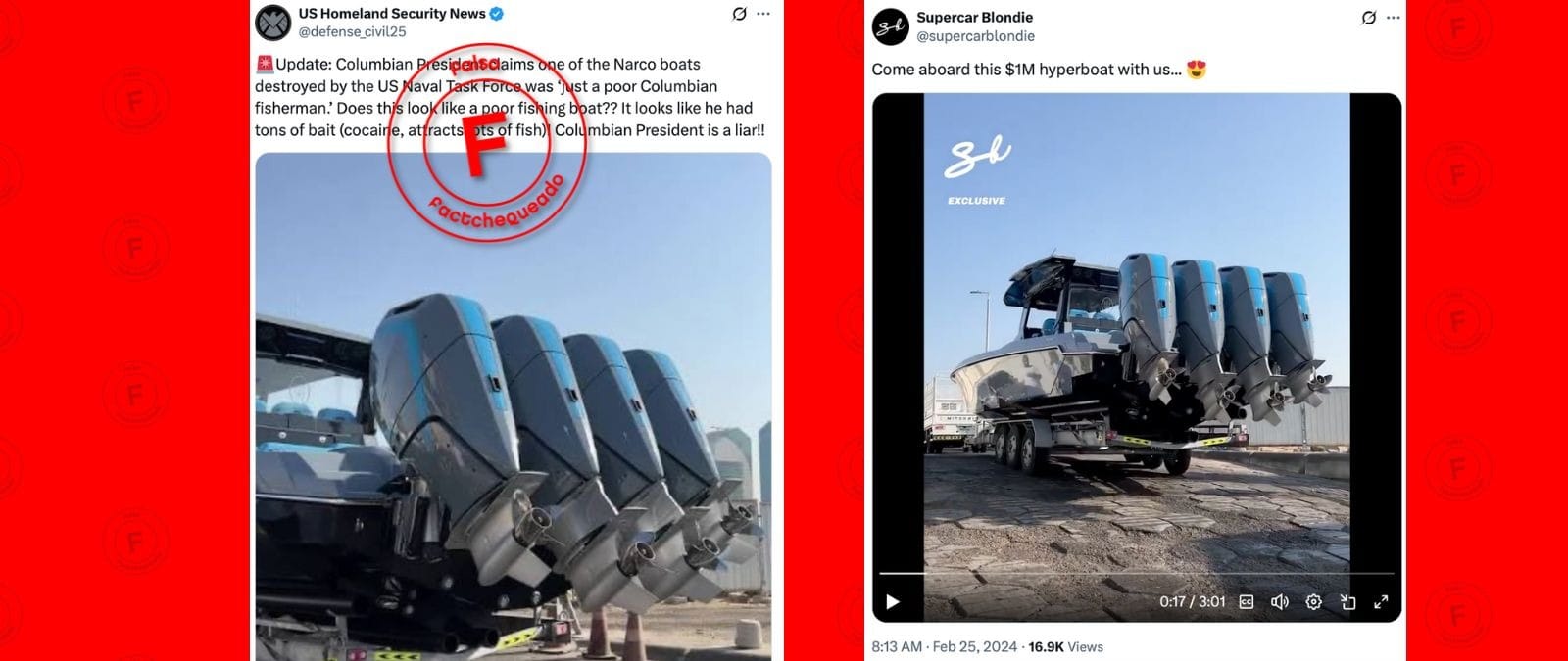 El 20 de octubre de 2025, la cuenta divulgó una supuesta imagen de una yate con 4 motores afirmando que era una de las lanchas atacadas. Pero una búsqueda inversa en Google Lens muestra que la imagen es, en realidad, una captura de un video de un yate de lujo que circula, al menos, desde febrero de 2024. Para cuando publicamos esta nota la cuenta no había eliminado el post y la imagen desinformante había sido vista más de 29,000 veces.