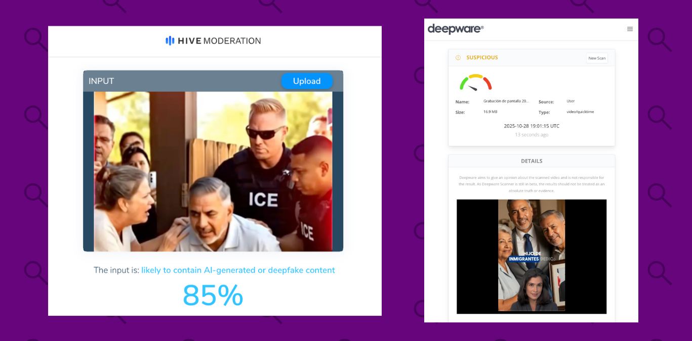 También hicimos capturas de pantalla del video y las analizamos en los detectores de imágenes con IA: Hive Moderation y Deepware. Hive Moderation detecta un 85% de probabilidades de que sea un video IA y Deepware lo califica como “suspicious” (sospechoso, en español).
