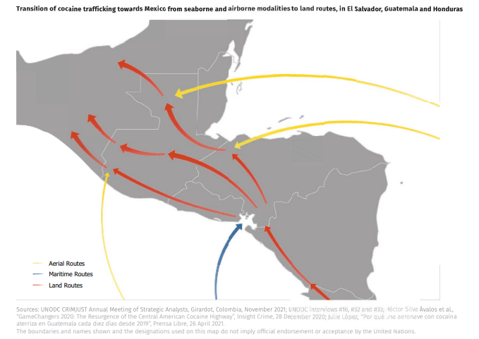 El Informe Global sobre la Cocaína publicado en 2023 por la Oficina de la ONU Contra la Droga y el Delito (el más reciente hasta la fecha) detalla cómo es el tránsito de la cocaína desde los principales países productores (Colombia, Perú y Bolivia) hasta México, que es “un importante país de tránsito” para que la droga llegue a Estados Unidos, donde están la mayoría de los consumidores de cocaína de Norteamérica.