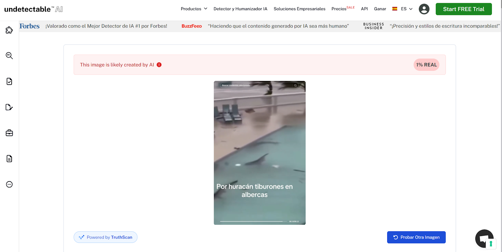 Al analizar el video con la herramienta Hive Moderation, esta no arrojó una gran probabilidad de que este video hubiera sido generado con inteligencia artificial. Sin embargo, el porcentaje aumentó considerablemente al extraer fotogramas del video y evaluarlos en Undetectable AI. En este caso, la herramienta indicó que solo hay un 1% de probabilidad de que la imagen sea auténtica. Es decir, un 99% de probabilidad de que se trate de un contenido creado por inteligencia artificial.