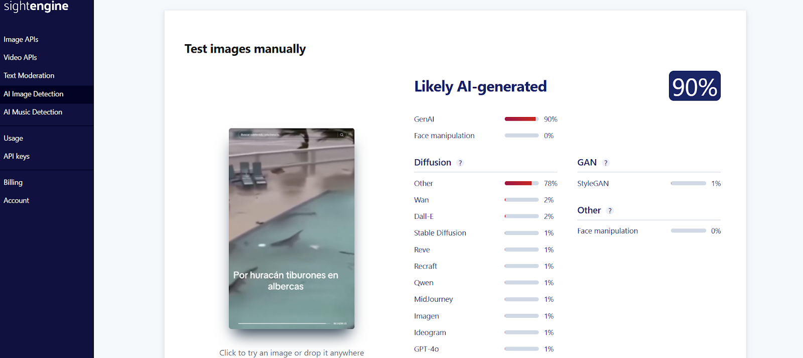 También subimos un fotograma del video a la herramienta Sightengine, que marcó un 90 % de probabilidad de que sea generado por inteligencia artificial.