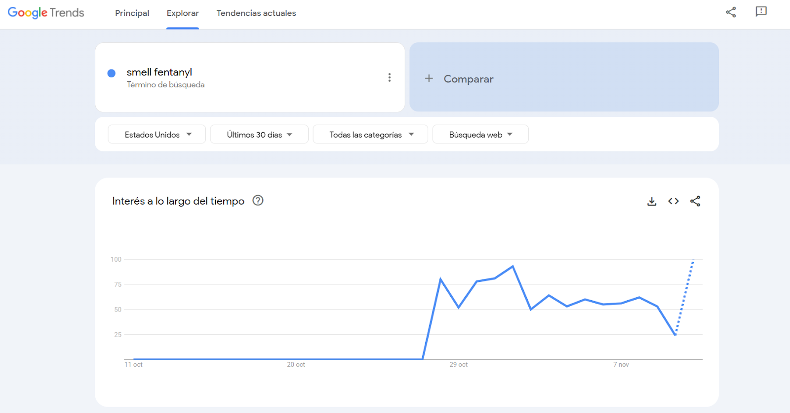 - Desde el 28 de octubre de 2025 aumentaron las búsquedas en Google relacionadas con el olor del fentanilo en Estados Unidos en inglés, según datos de Google Trends.