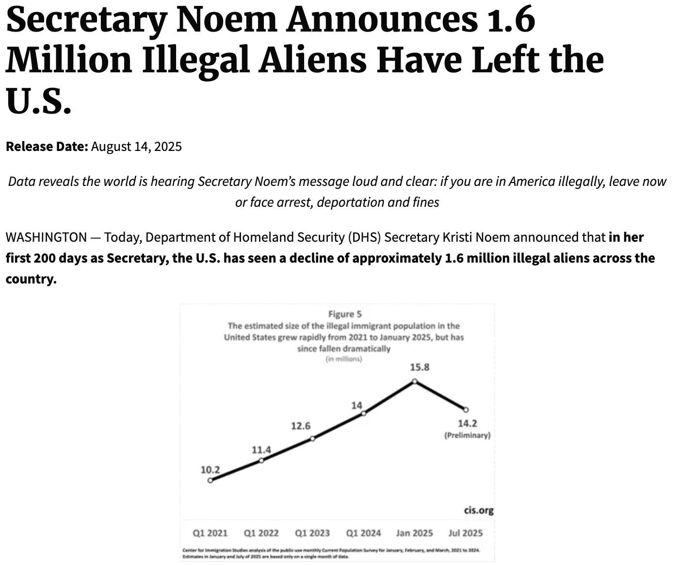 El DHS ha hecho referencia en varias ocasiones a los “1.6 millones de autodeportados” sin citar ninguna fuente. En un comunicado de prensa del 14 de agosto de 2025, sin embargo, publicaron un gráfico del Center for Immigration Studies (CIS), una organización sin fines de lucro que promueve “menos inmigrantes, pero una bienvenida más cálida para quienes son admitidos”.