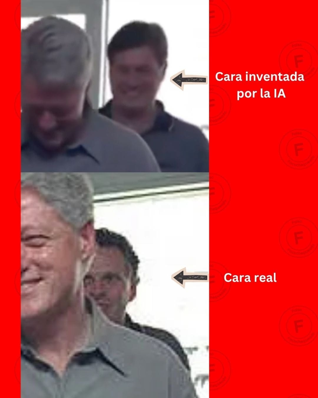 La IA también alucina e inventa una cara y pelo para el hombre que aparece detrás de Clinton. Cuando revisamos otras imágenes divulgadas por la Biblioteca Presidencial de Clinton de ese mismo evento, vemos que la cara real de esta persona es diferente y que el pelo no es liso sino ondulado.