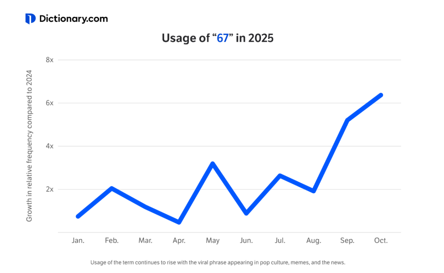 - “67” es la palabra del año 2025, según Dictionary.com. Este término se volvió viral en redes sociales. Se pronuncia “six seven” mientras se mueven alternativamente las palmas de las manos hacia arriba y hacia abajo.