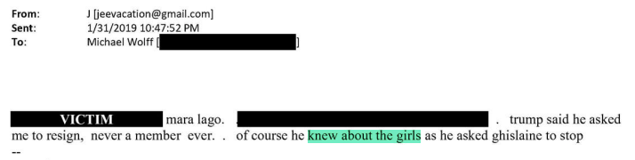 El 31 de enero de 2019, Epstein envió un correo electrónico a periodista Michael Wolff –autor de libros sobre Trump–, afirmando: “...por supuesto que [Trump] sabía sobre las chicas ya que le pidió a Ghislaine [Maxwell] que parara”.