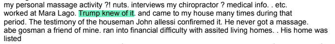 - El 1 de febrero de 2019, Epstein, en un correo supuestamente enviado a sí mismo, afirmó: “Trump lo sabía. Y vino a mi casa muchas veces durante ese período”. Sin embargo, en ese mismo correo también afirma que Trump “nunca recibió un masaje”. De acuerdo con la acusación criminal contra Epstein, sus víctimas eran reclutadas para proporcionar “masajes” que luego “se volvían cada vez más de naturaleza sexual y normalmente incluían uno o más actos sexuales”.