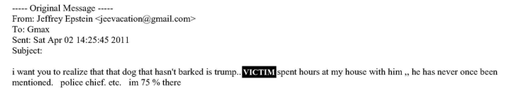 - El 2 de abril de 2011, Epstein envió un correo electrónico a Maxwell, afirmando: “Quiero que te des cuenta que el perro que no ha ladrado es Trump”, y añade que una chica –cuyo nombre está oculto en el correo con la palabra “víctima” superpuesta para proteger su identidad– “pasó horas en mi casa con él [Trump]”.