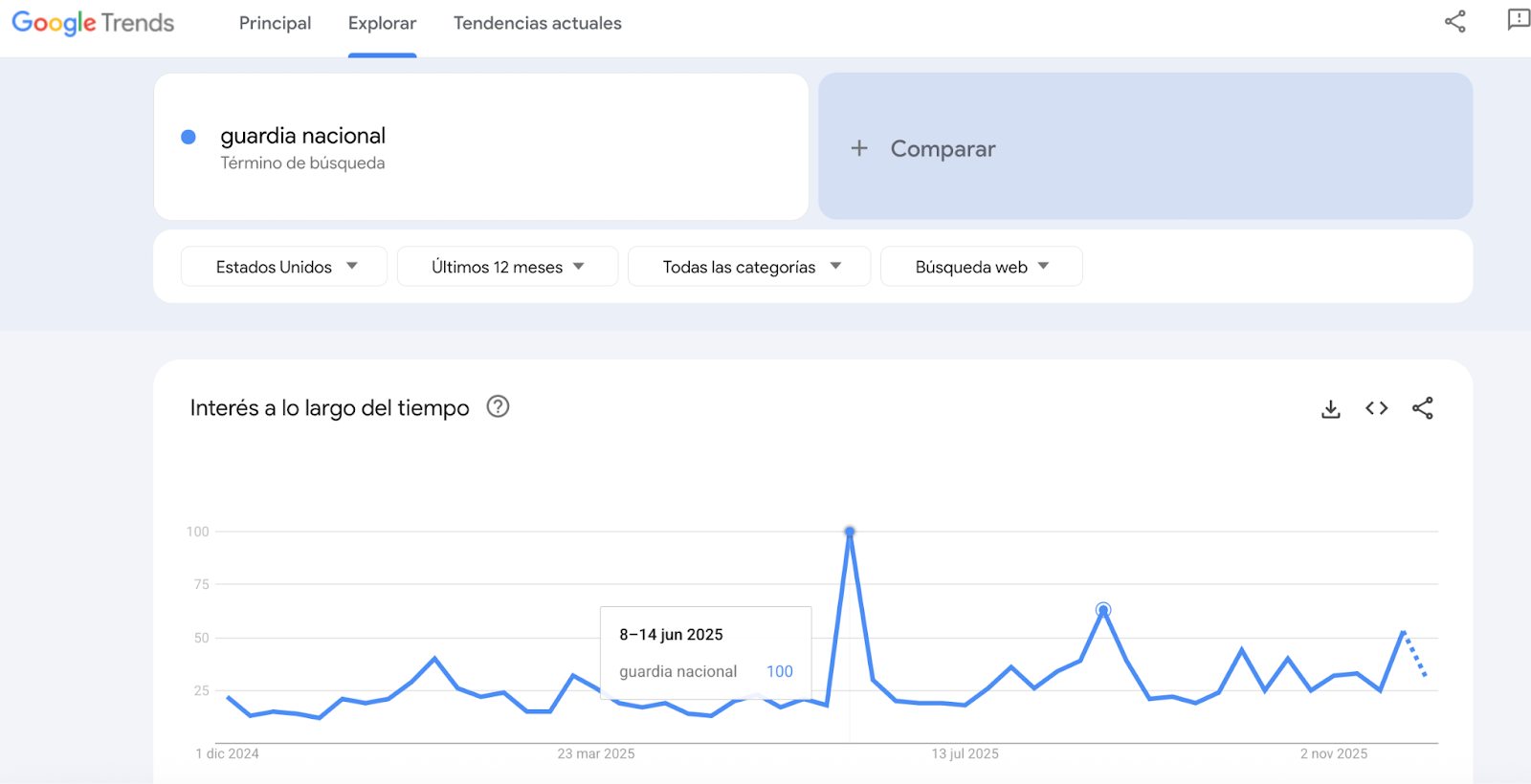 Entre mediados de junio y principios de diciembre de 2025 se ha registrado un aumento en las búsquedas en español en Estados Unidos relacionadas con la Guardia Nacional, según datos de Google Trends.
