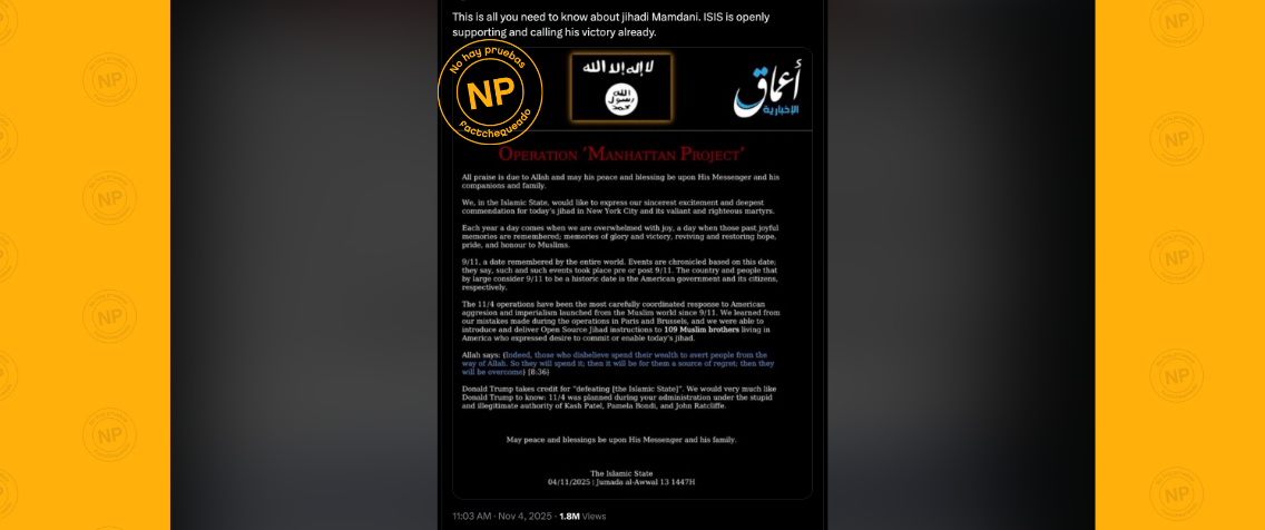 Influencers de derecha compartieron un comunicado atribuido al Estado Islámico donde aparentemente felicitan a Mamdani por su victoria del 4 de noviembre de 2025. El comunicado en inglés lleva el título “Operation ‘Manhattan Project’” e incluye los logos del Estado Islámico y la Amaq News Agency, la agencia designada como “parte del aparato de propaganda de la organización terrorista y que se utilizó para reivindicar atentados del ISIS o inspirados por el ISIS” en 2019, según el Departamento de Estado de Estados Unidos.