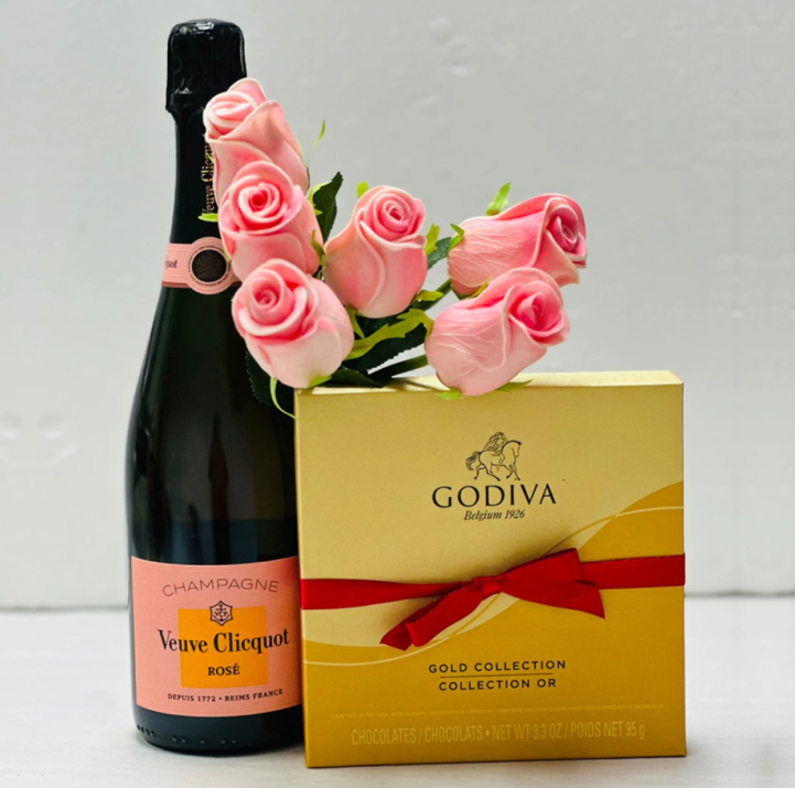 Las gift baskets siguen siendo tendencia porque convierten un regalo en experiencia. Hay opciones para ella, para él y para parejas, con champagne, vino, chocolates o versiones sin alcohol. Importante: los precios varían según proveedor (entre los $100 y $500), pero todas se venden como sets cerrados listos para regalar.