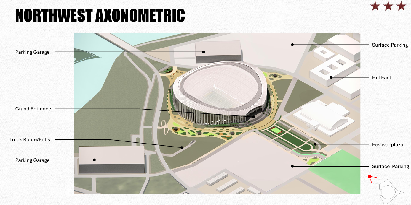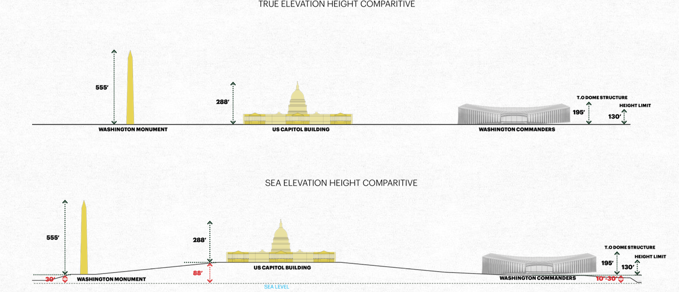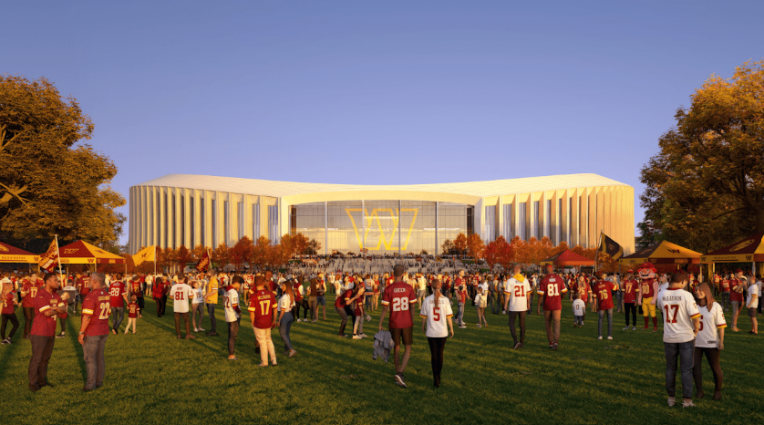 Los nuevos planos y renderizados muestran un estadio inspirado en los monumentos y memoriales de DC, con columnas de ocho puntas que representan los ocho vecindarios de la ciudad y un techo cubierto que alcanzará aproximadamente 195 pies de altura, unos 100 pies menos que el Capitolio de EEUU. Los arquitectos de HKS lideran el diseño del estadio, que busca ofrecer una experiencia visual atractiva tanto para fanáticos en días de partido como para vecinos que transitan la zona en días normales.